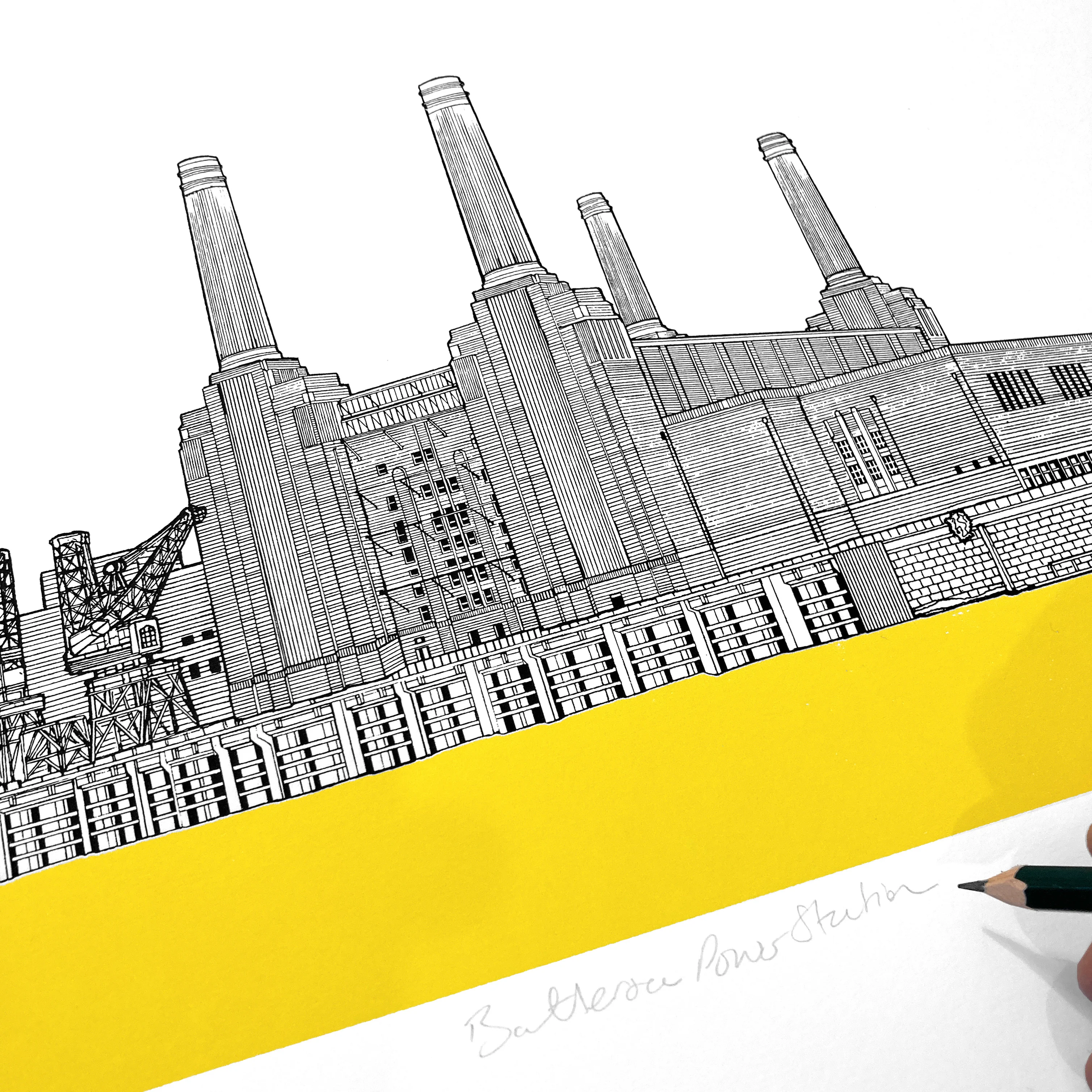 Detailed architectural illustration of Battersea Power Station by Will Clarke.