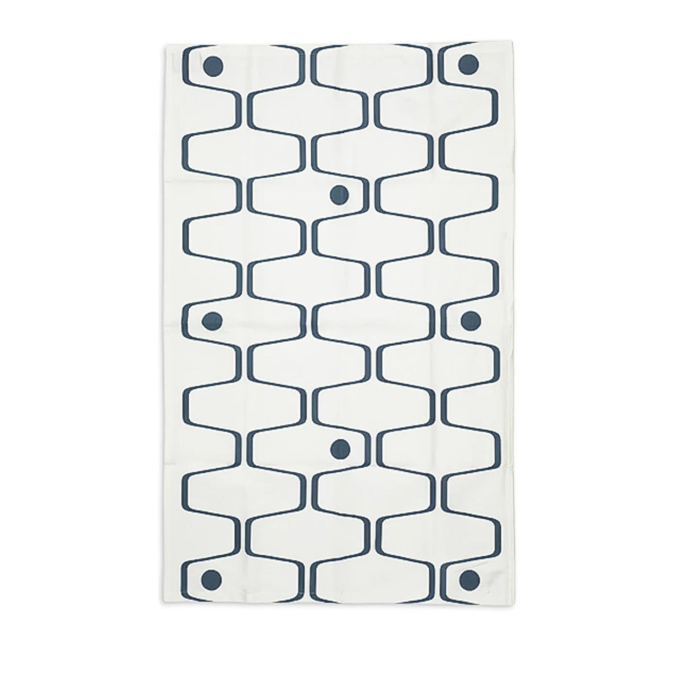 The pattern known as 'Net & Ball' was originally created by Peter Moro and Leslie Martin for the carpet in Royal Festival Hall when it opened at the Festival of Britain in 1951. It is based on a square wave seen with an oscilloscope - the visual representation of sound.