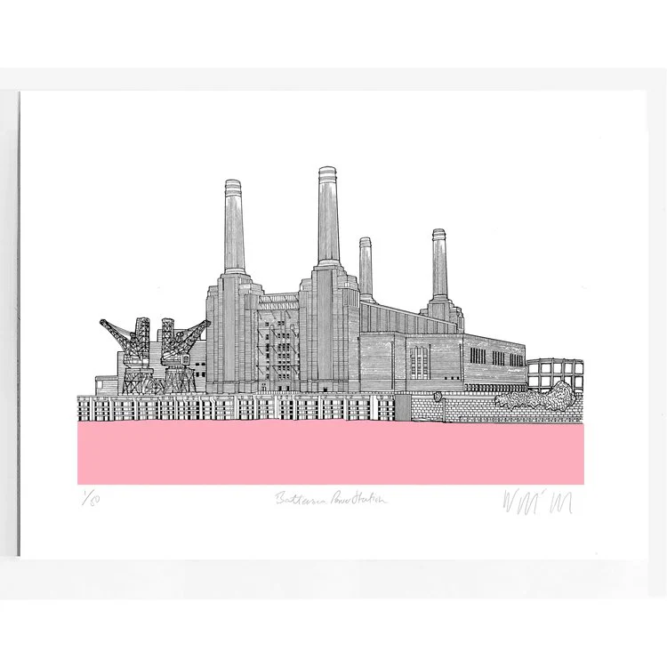 Detailed architectural illustration of Battersea Power Station by Will Clarke.