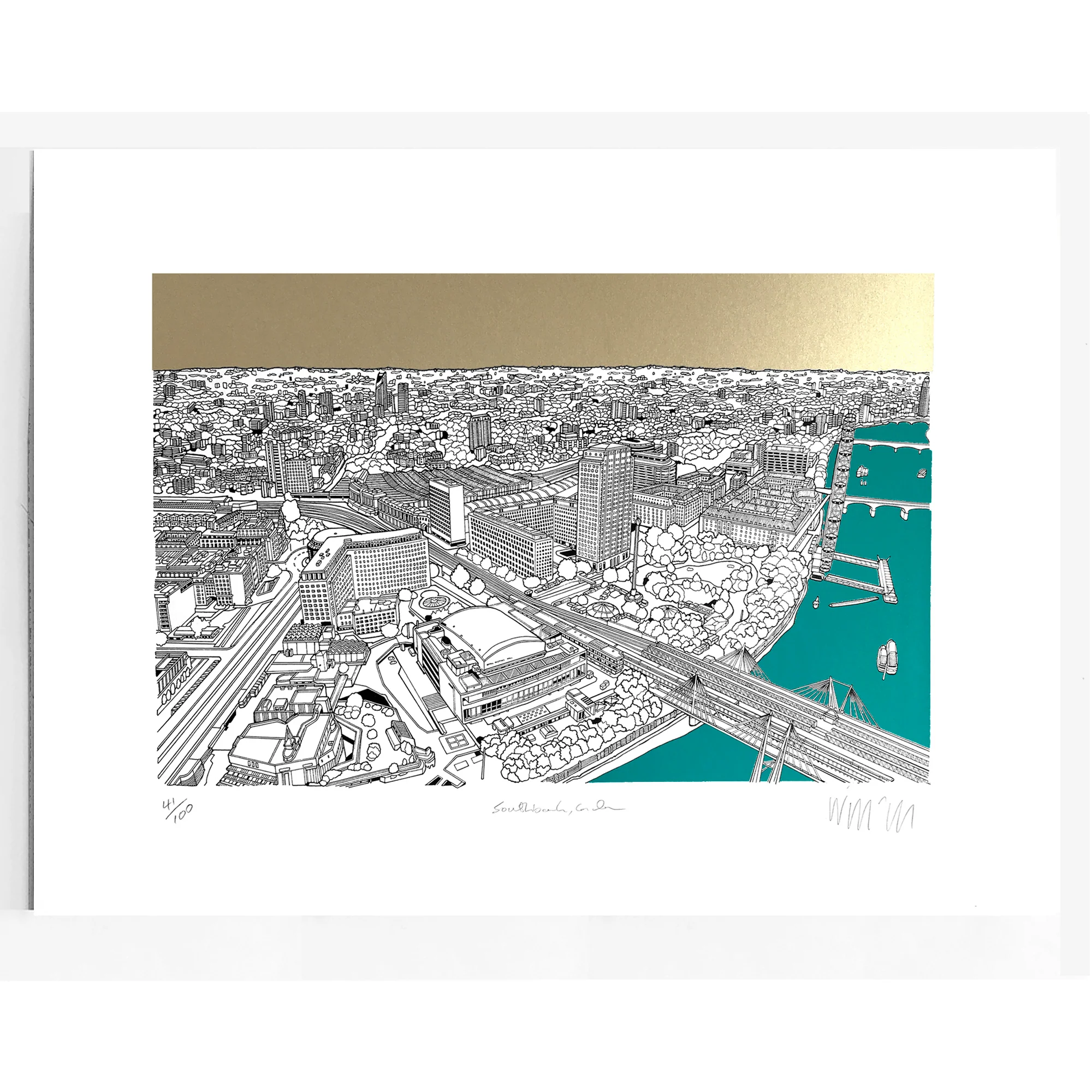 Having carefully illustrated this iconic area of London’s riverside, Will has hand screen-printed this limited edition A2 screen print in a rich pale gold, turquoise and black.