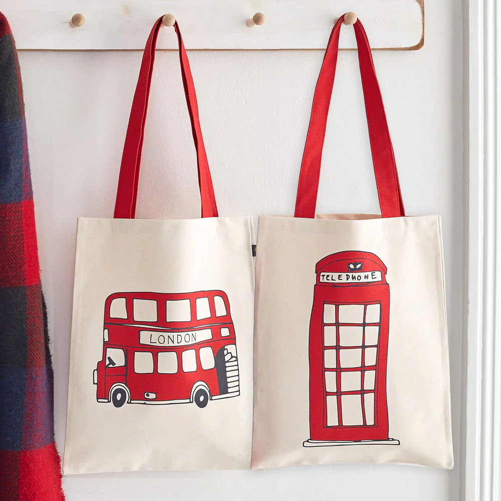 This Telephone Box and London Bus reversible canvas bag features nostalgic and whimsical illustrations of two London icons so associated with Britishness that tourists can often been seen posing beside them. This playful canvas bag by Victoria Eggs is strong enough to fill with even the heaviest of items making it perfect for your next shopping trip the Big Smoke!